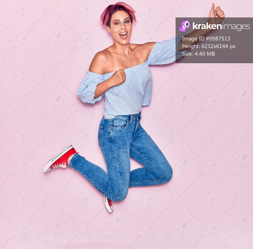Young beautiful woman with pink short hair wearing casual clothes smiling happy. Jumping with smile on face with cheerful gesture over isolated background. - Kraken Images