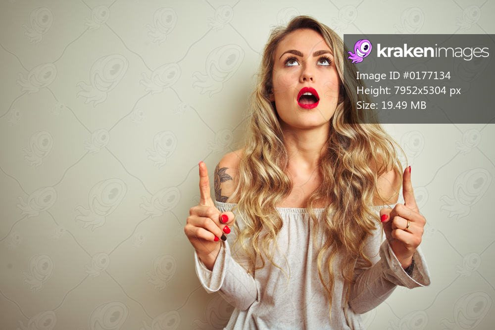 Young beautiful woman standing over white isolated background amazed and surprised looking up and pointing with fingers and raised arms.