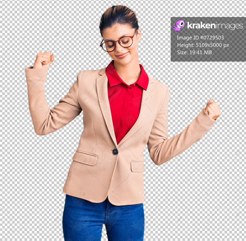 Young beautiful woman wearing business shirt and glasses showing arms muscles smiling proud. fitness concept.