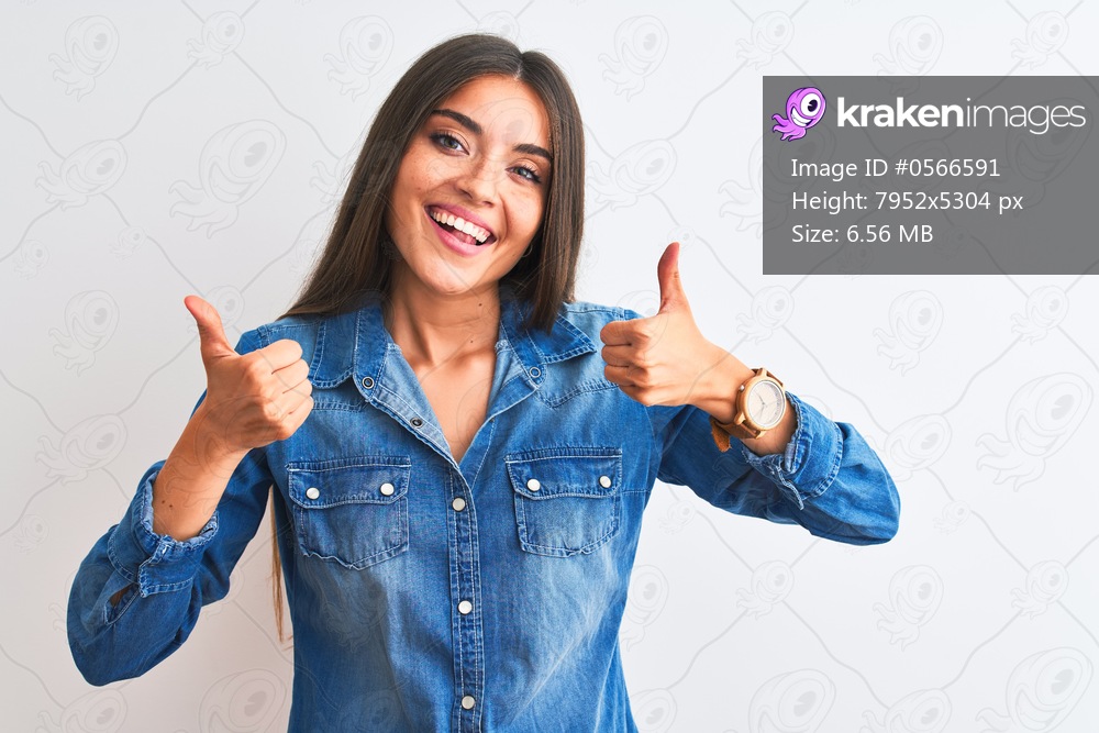 Young beautiful woman wearing casual denim shirt standing over isolated white background success sign doing positive gesture with hand, thumbs up smiling and happy. Cheerful expression and winner gesture. - Kraken Images
