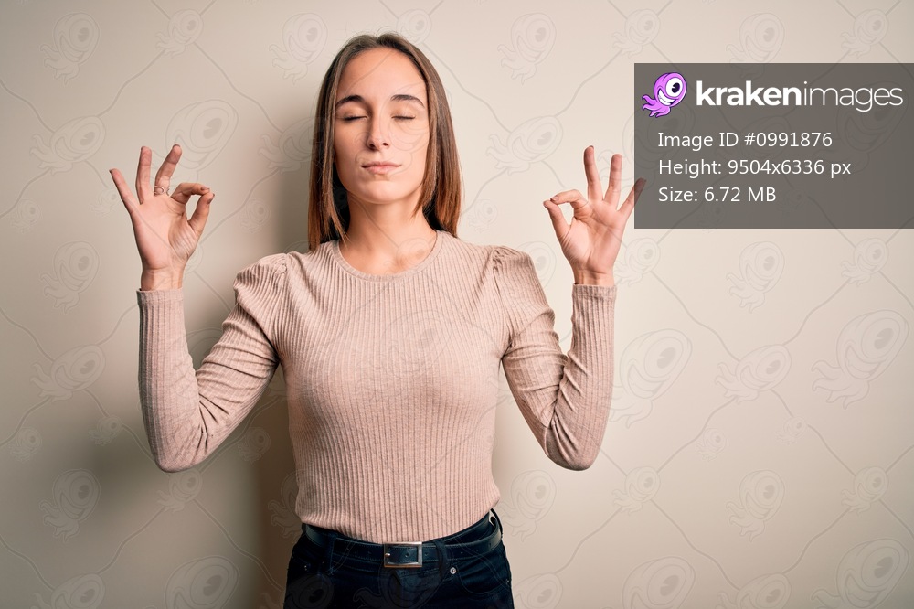 Young beautiful woman wearing casual sweater standing over isolated white background relax and smiling with eyes closed doing meditation gesture with fingers. Yoga concept. - Kraken Images