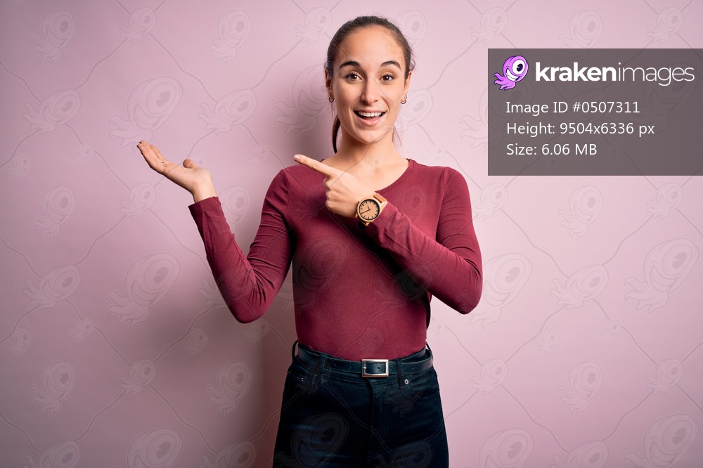 Young beautiful woman wearing casual t-shirt standing over isolated pink background amazed and smiling to the camera while presenting with hand and pointing with finger. - Kraken Images