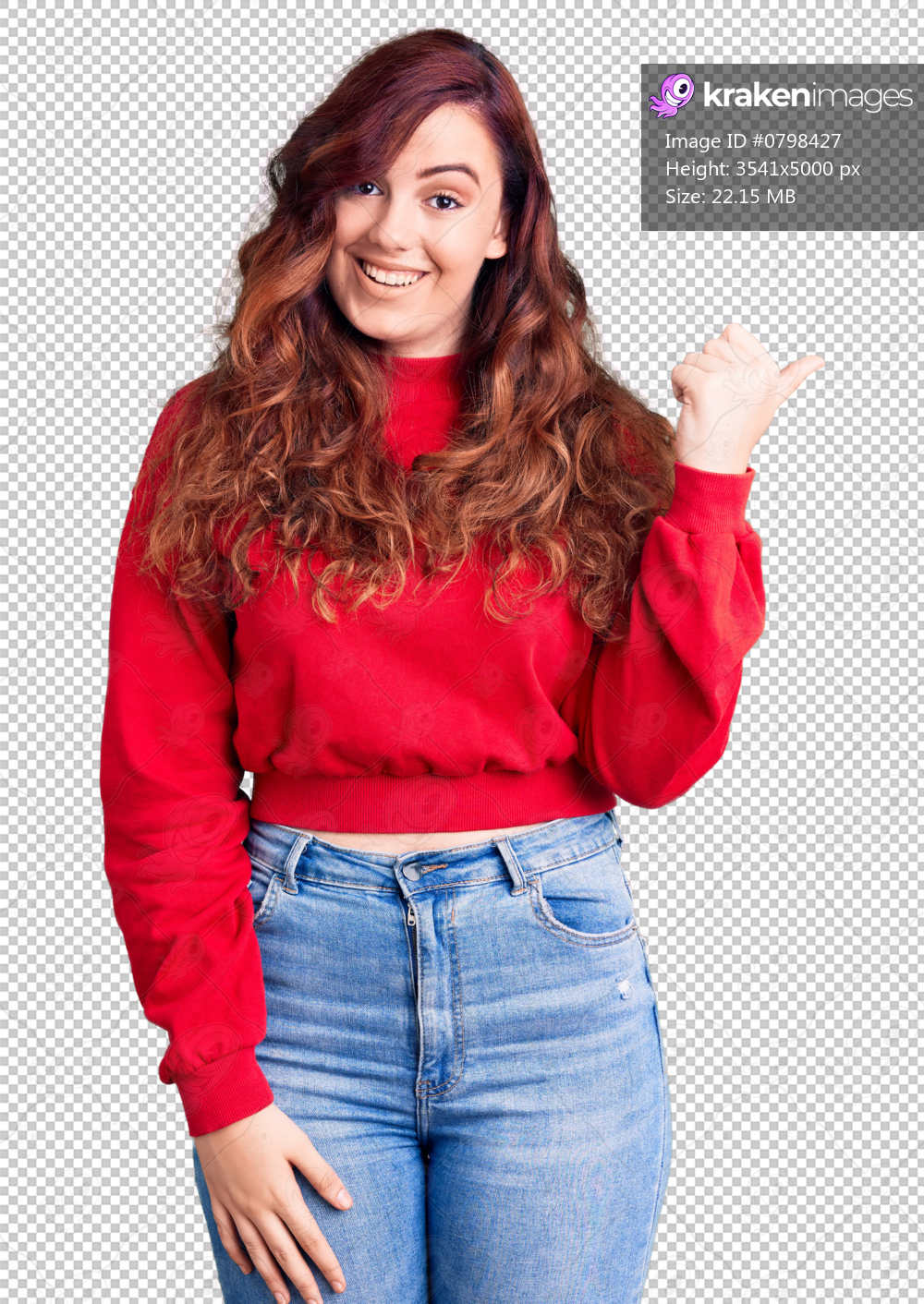 Young beautiful woman wearing casual winter sweater smiling with happy face looking and pointing to the side with thumb up.