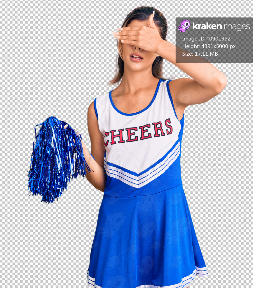 Young beautiful woman wearing cheerleader uniform covering eyes with hand, looking serious and sad. sightless, hiding and rejection concept