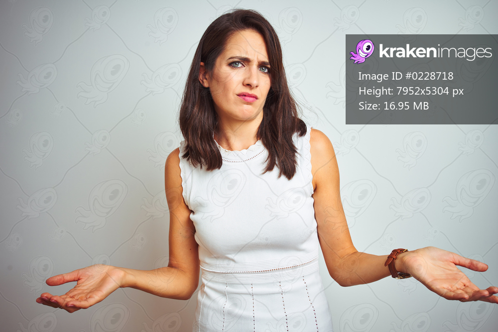Young beautiful woman wearing dress standing over white isolated background clueless and confused with open arms, no idea concept.