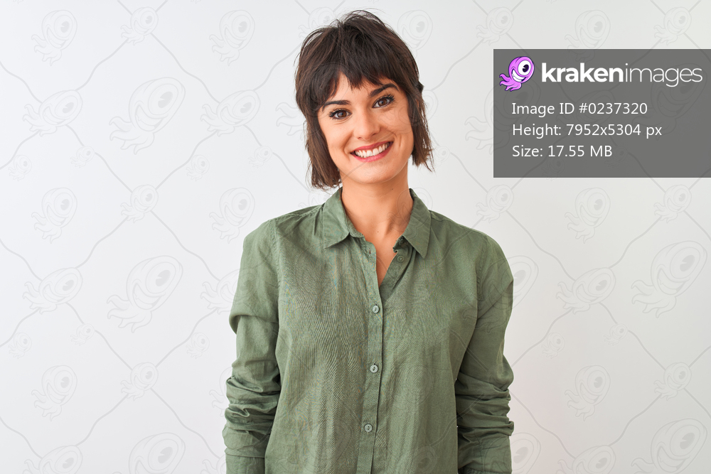 Young beautiful woman wearing green casual shirt standing over isolated white background with a happy and cool smile on face. Lucky person.