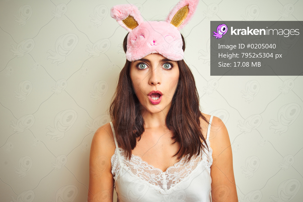 Young beautiful woman wearing pajama and mask standing over white isolated background afraid and shocked with surprise expression, fear and excited face. - Kraken Images