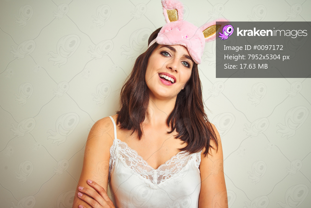 Young beautiful woman wearing pajama and mask standing over white isolated background happy face smiling with crossed arms looking at the camera. Positive person. - Kraken Images