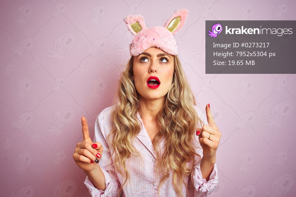 Young beautiful woman wearing pajama and sleep mask over pink isolated background amazed and surprised looking up and pointing with fingers and raised arms. - Kraken Images
