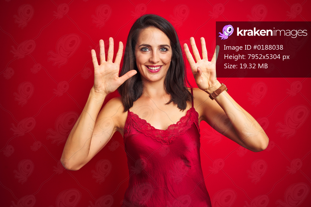 Young beautiful woman wearing sexy lingerie over red isolated background showing and pointing up with fingers number nine while smiling confident and happy. - Kraken Images