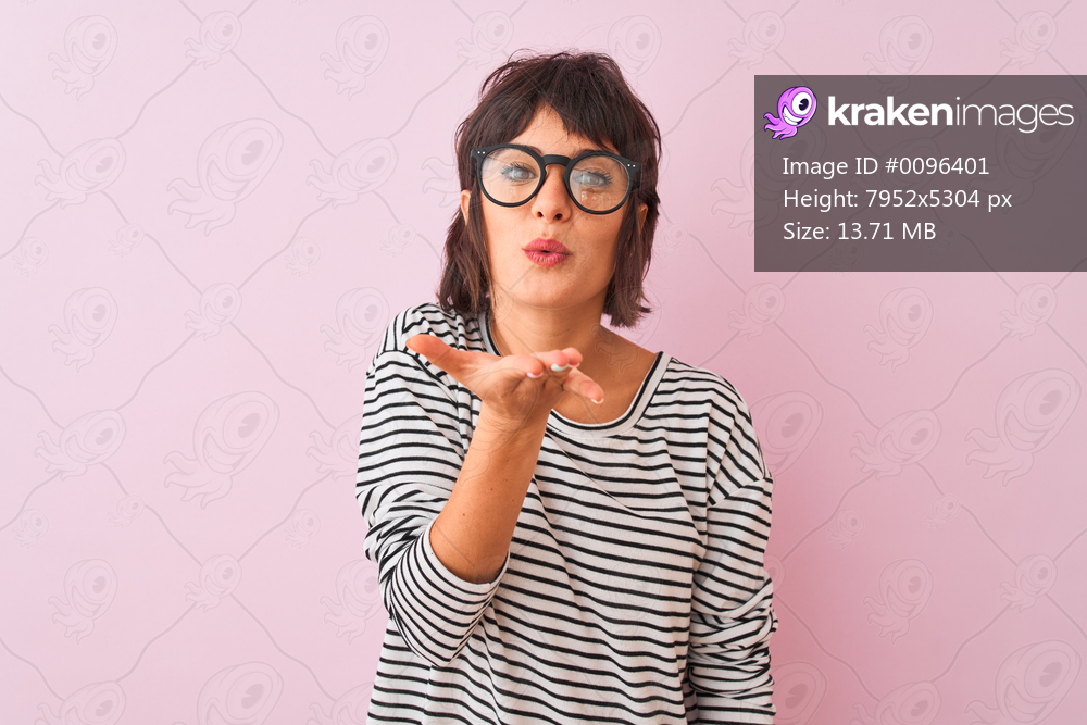 Young beautiful woman wearing striped t-shirt and glasses over isolated pink background looking at the camera blowing a kiss with hand on air being lovely and sexy. Love expression. - Kraken Images