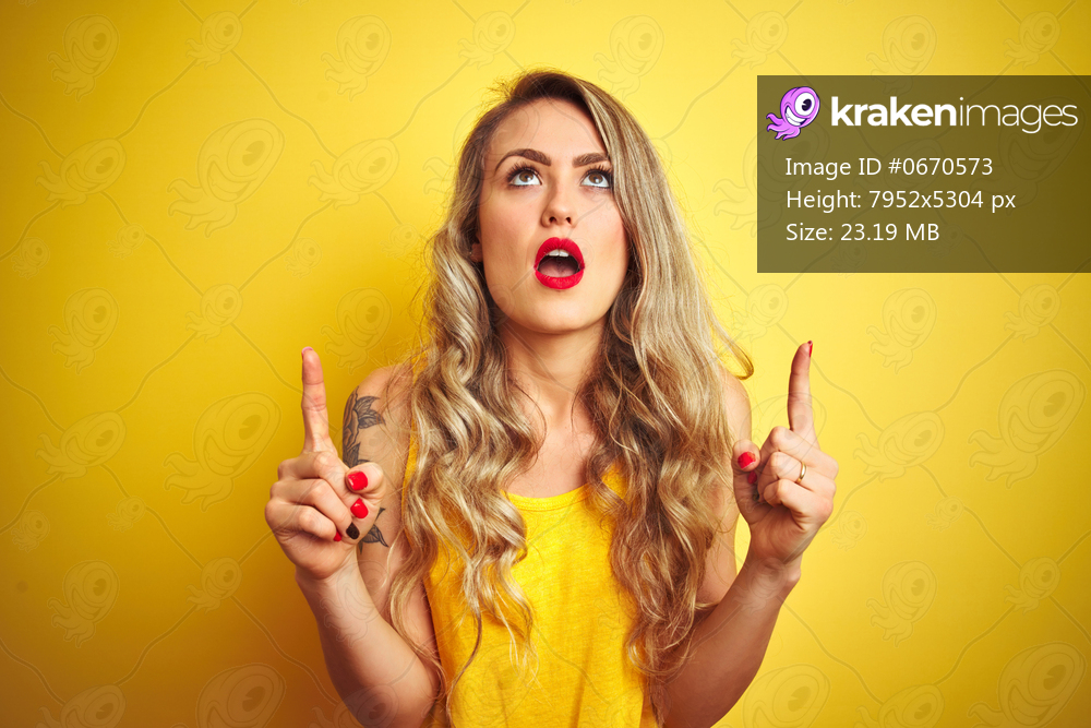 Young beautiful woman wearing t-shirt standing over yellow isolated background amazed and surprised looking up and pointing with fingers and raised arms. - Kraken Images
