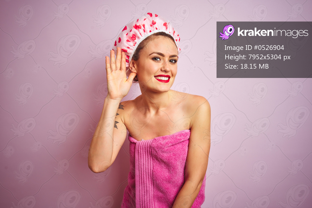 Young beautiful woman wearing towel and bath hat after shower over pink isolated background smiling with hand over ear listening an hearing to rumor or gossip. Deafness concept. - Kraken Images