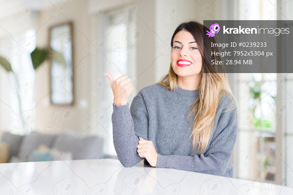 Young beautiful woman wearing winter sweater at home smiling with happy face looking and pointing to the side with thumb up.