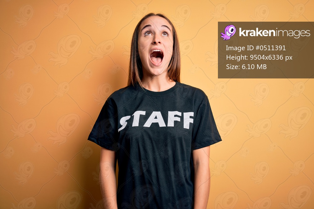 Young beautiful worker woman wearing staff uniform t-shirt over isolated yellow background angry and mad screaming frustrated and furious, shouting with anger. Rage and aggressive concept. - Kraken Images