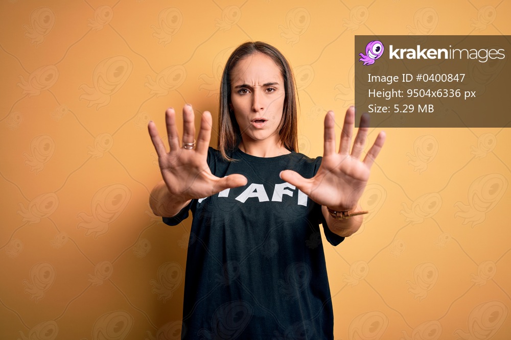 Young beautiful worker woman wearing staff uniform t-shirt over isolated yellow background doing stop gesture with hands palms, angry and frustration expression