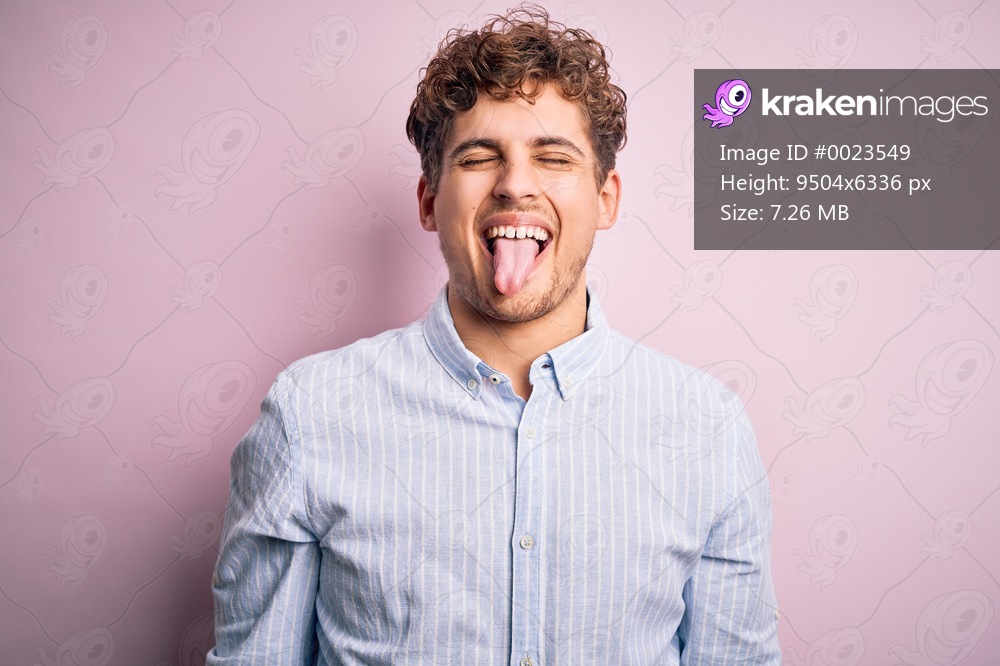 Young blond handsome man with curly hair wearing striped shirt over white background sticking tongue out happy with funny expression. Emotion concept.