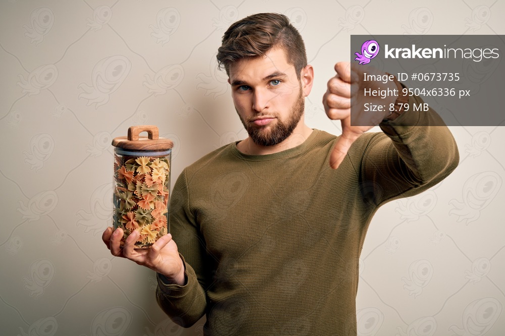 Young blond man with beard and blue eyes holding bottle of Italian dry pasta with angry face, negative sign showing dislike with thumbs down, rejection concept - Kraken Images