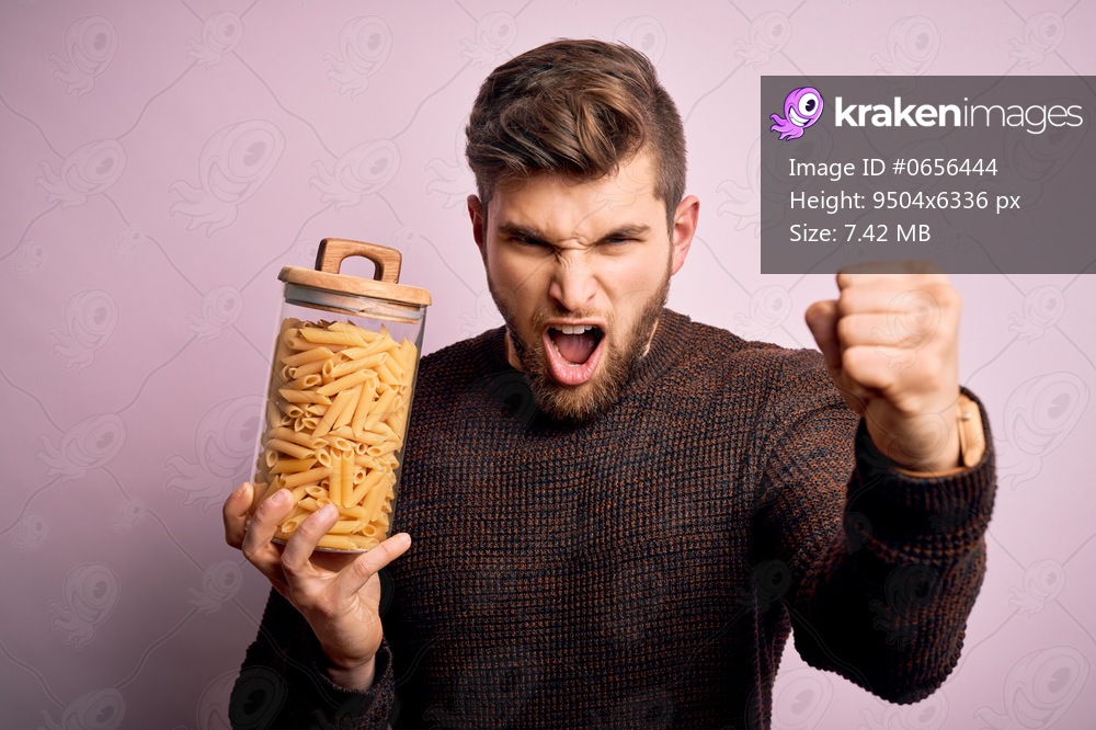 Young blond man with beard and blue eyes holding bottle of Italian dry pasta macaroni annoyed and frustrated shouting with anger, crazy and yelling with raised hand, anger concept - Kraken Images