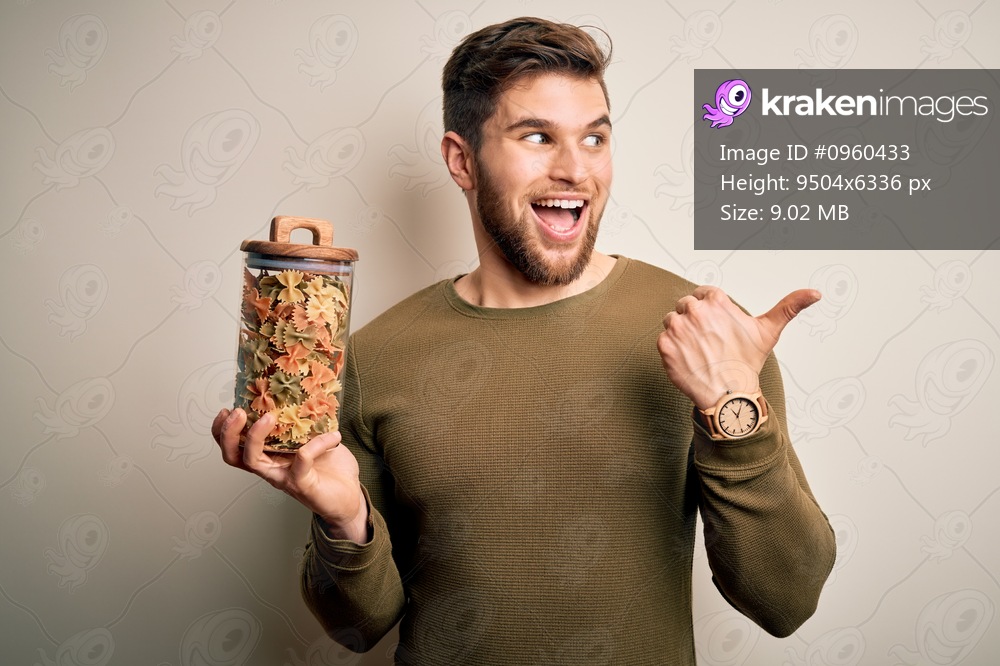 Young blond man with beard and blue eyes holding bottle of Italian dry pasta pointing and showing with thumb up to the side with happy face smiling