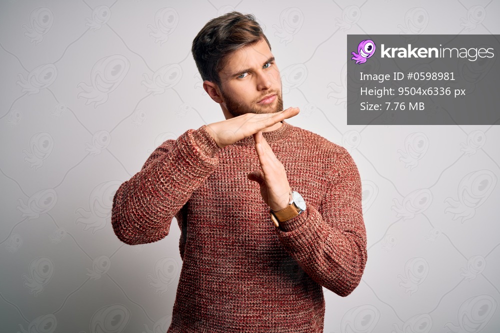 Young blond man with beard and blue eyes wearing casual sweater over white background Doing time out gesture with hands, frustrated and serious face