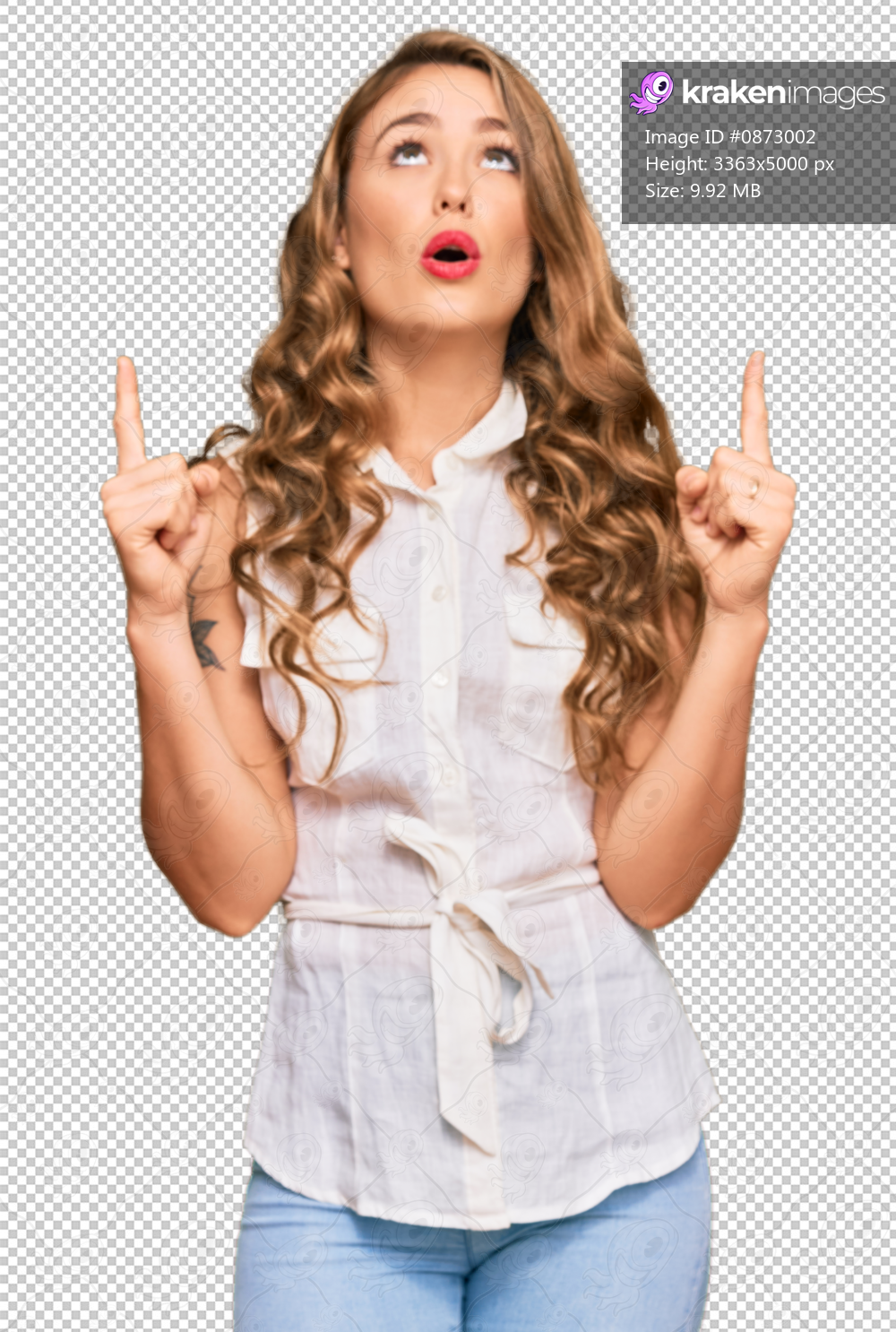 Young blonde girl wearing casual clothes amazed and surprised looking up and pointing with fingers and raised arms.