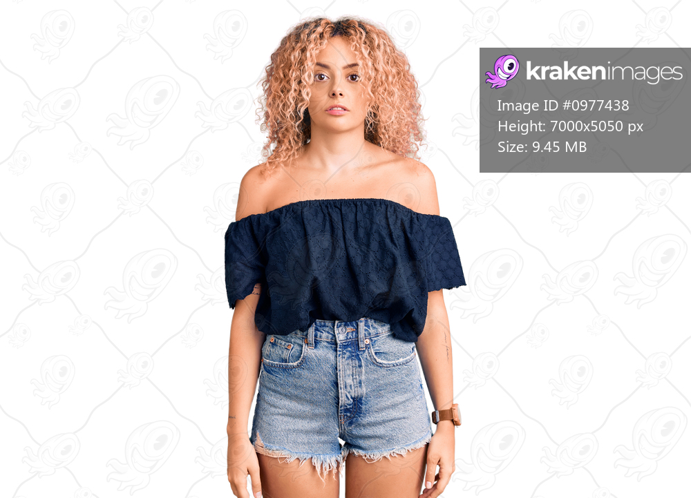 Young blonde woman with curly hair wearing casual summer clothes with serious expression on face. simple and natural looking at the camera.