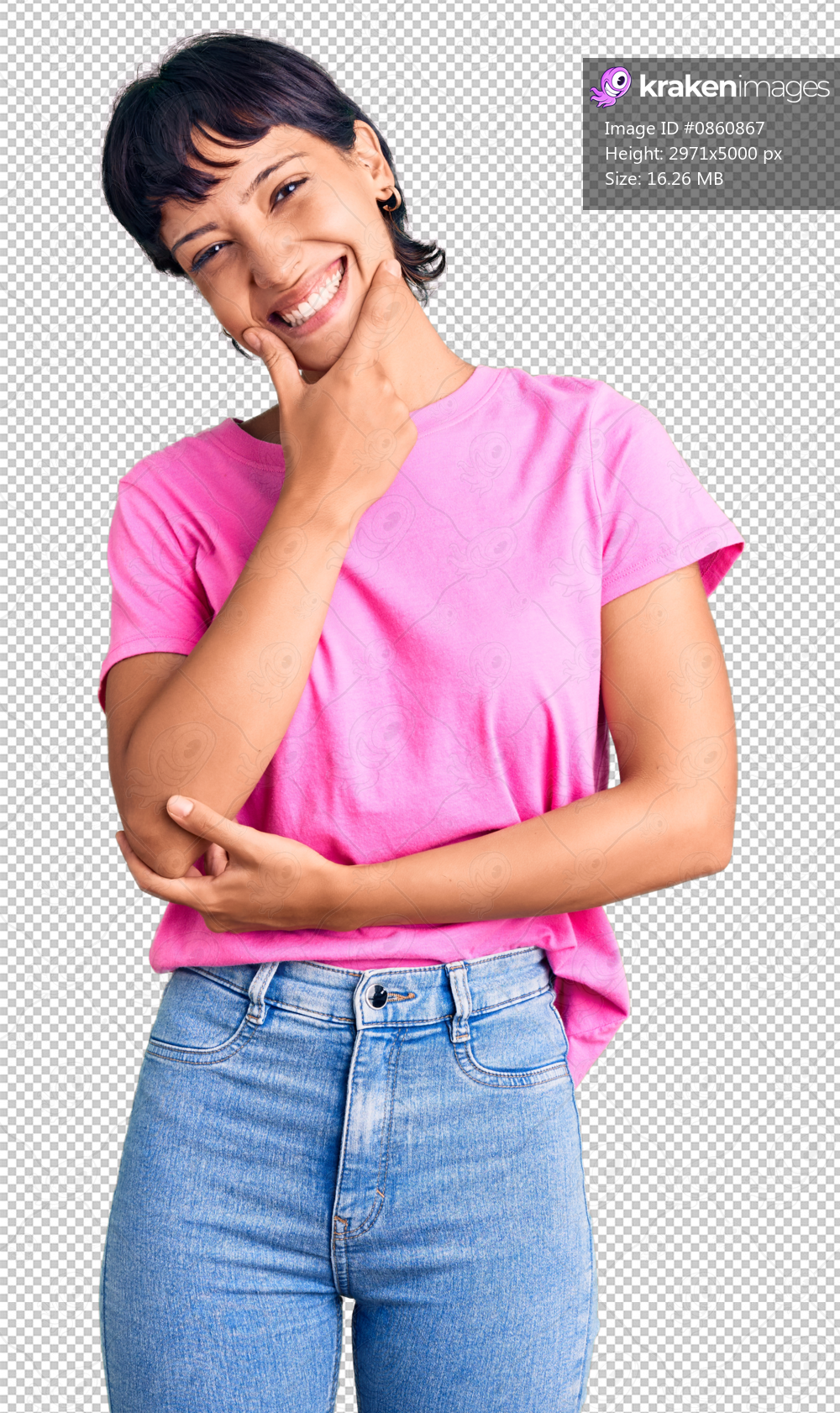 Young brunette woman with short hair wearing casual clothes looking confident at the camera smiling with crossed arms and hand raised on chin. thinking positive. - Kraken Images