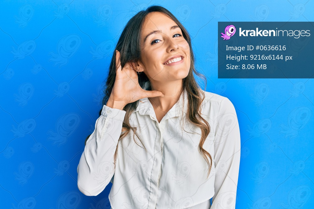 Young brunette woman wearing casual clothes smiling with hand over ear listening and hearing to rumor or gossip. deafness concept.