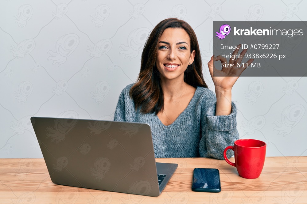 Young brunette woman working at the office using computer laptop doing ok sign with fingers, smiling friendly gesturing excellent symbol