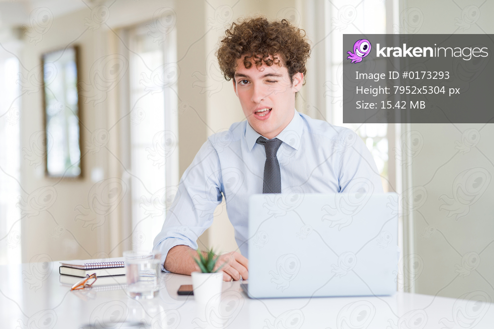 Young business man working with computer laptop at the office winking looking at the camera with sexy expression, cheerful and happy face.