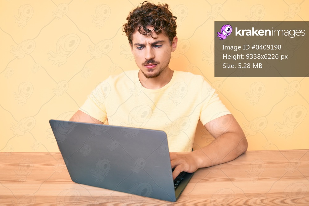 Young caucasian man with curly hair working at the office with laptop thinking attitude and sober expression looking self confident