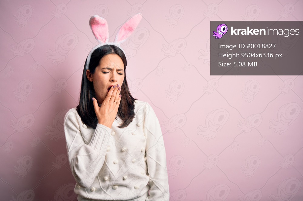Young caucasian woman wearing cute easter rabbit ears over pink isolated background bored yawning tired covering mouth with hand. Restless and sleepiness.