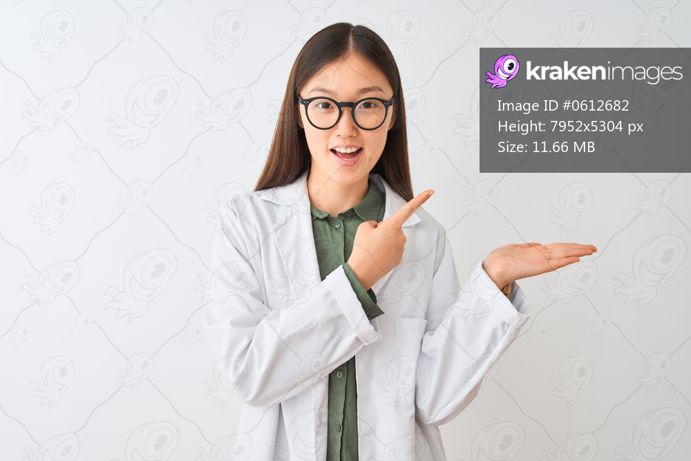 Young chinese scientist woman wearing coat and glasses over isolated white background amazed and smiling to the camera while presenting with hand and pointing with finger. - Kraken Images