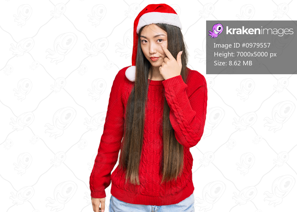 Young chinese woman wearing christmas hat pointing to the eye watching you gesture, suspicious expression