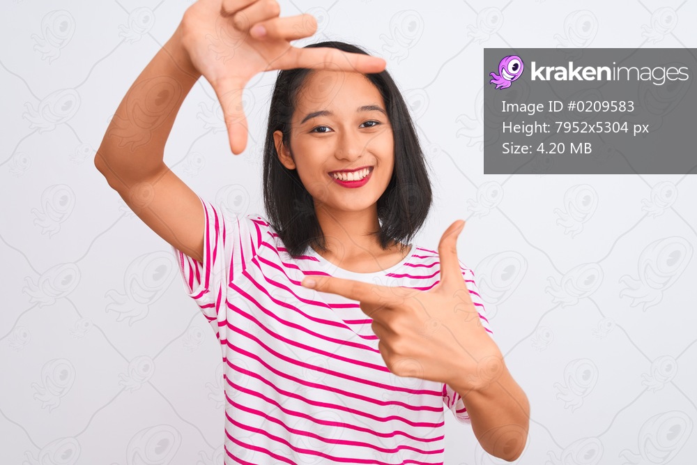 Young chinese woman wearing striped t-shirt standing over isolated white background smiling making frame with hands and fingers with happy face. Creativity and photography concept. - Kraken Images