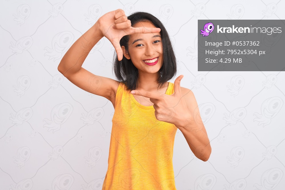 Young chinese woman wearing yellow casual t-shirt standing over isolated white background smiling making frame with hands and fingers with happy face. Creativity and photography concept. - Kraken Images