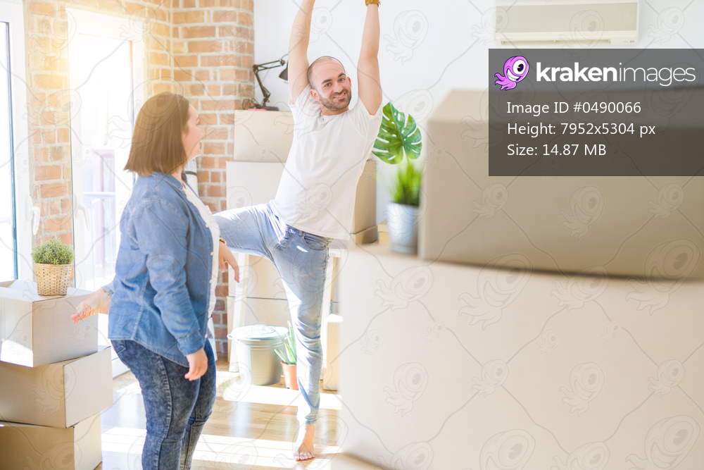 Young couple dancing around cardboard boxes at new home, celebrating smiling very happy new house