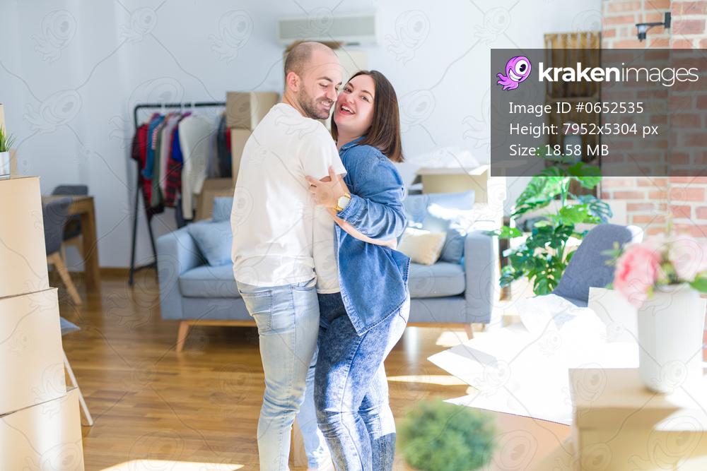 Young couple dancing around cardboard boxes at new home, celebrating smiling very happy new house