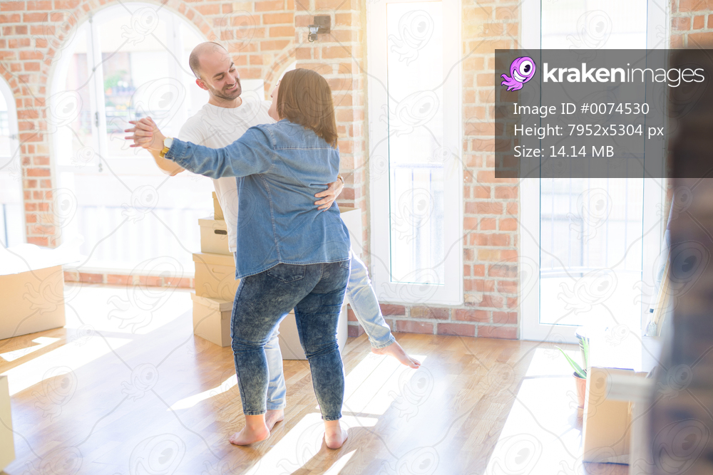 Young couple dancing around cardboard boxes at new home, celebrating smiling very happy new house