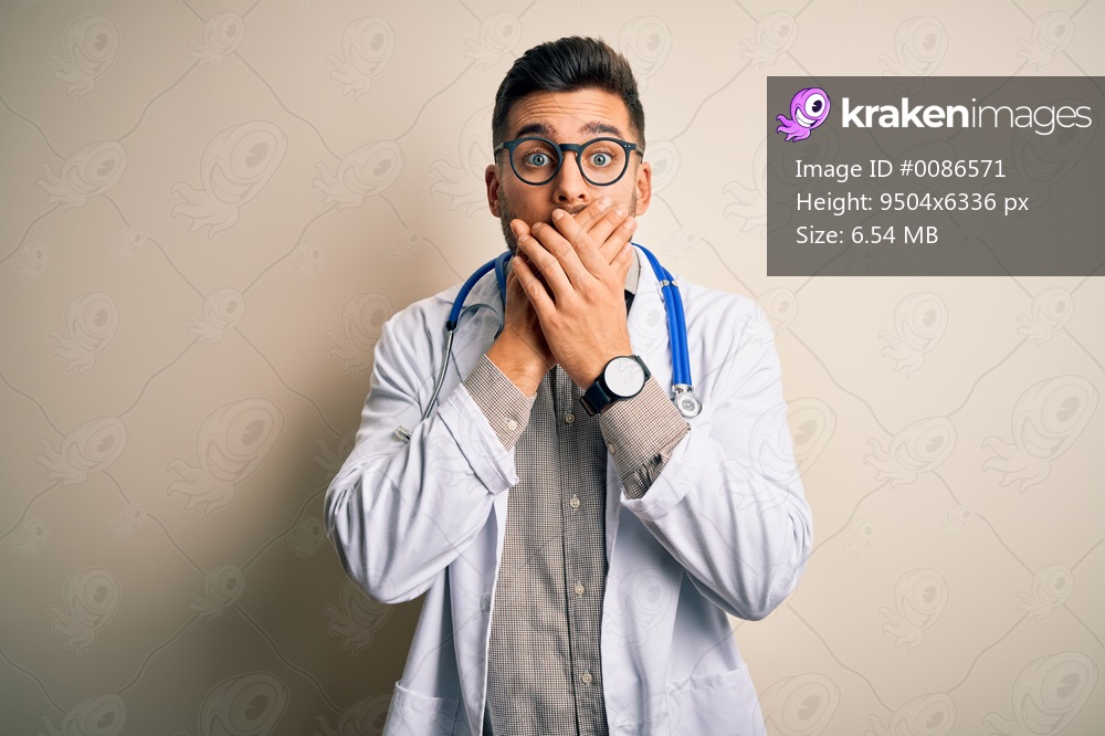 Young doctor man wearing glasses, medical white robe and stethoscope over isolated background shocked covering mouth with hands for mistake. Secret concept. - Kraken Images