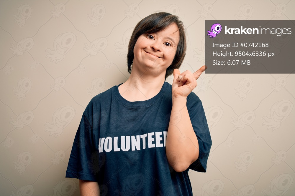 Young down syndrome volunteer woman wearing social care charity t-shirt cheerful with a smile on face pointing with hand and finger up to the side with happy and natural expression - Kraken Images