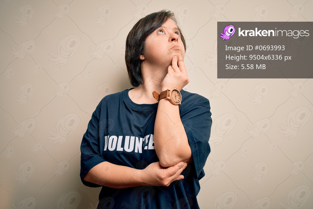 Young down syndrome volunteer woman wearing social care charity t-shirt with hand on chin thinking about question, pensive expression. Smiling with thoughtful face. Doubt concept. - Kraken Images
