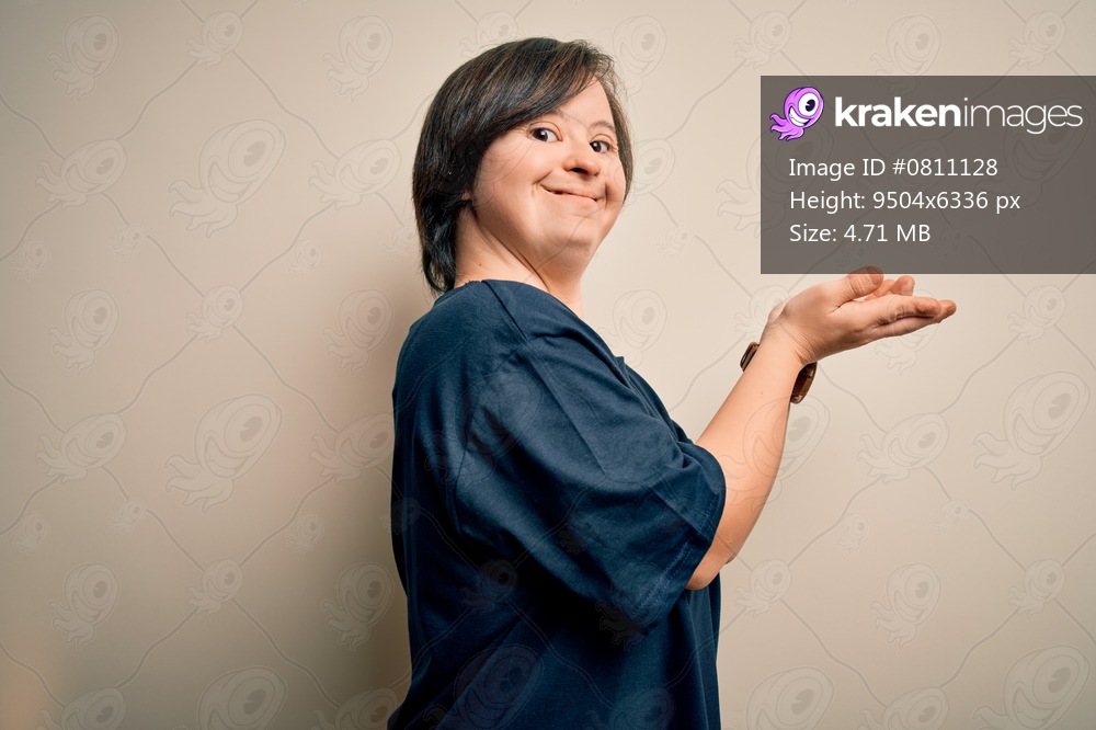 Young down syndrome volunteer woman wearing social care charity t-shirt pointing aside with hands open palms showing copy space, presenting advertisement smiling excited happy - Kraken Images