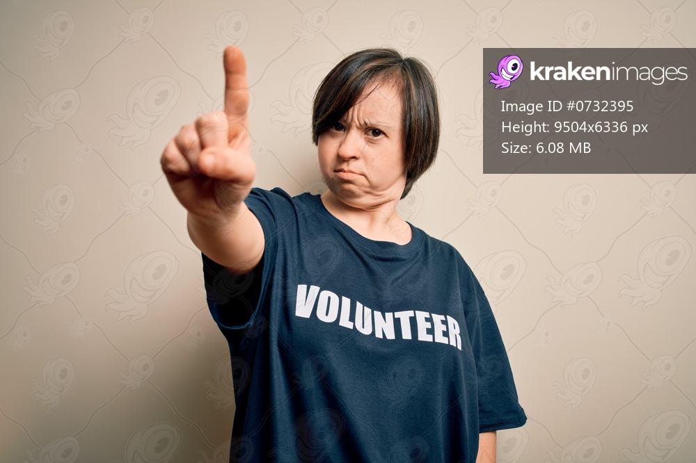 Young down syndrome volunteer woman wearing social care charity t-shirt Pointing with finger up and angry expression, showing no gesture
