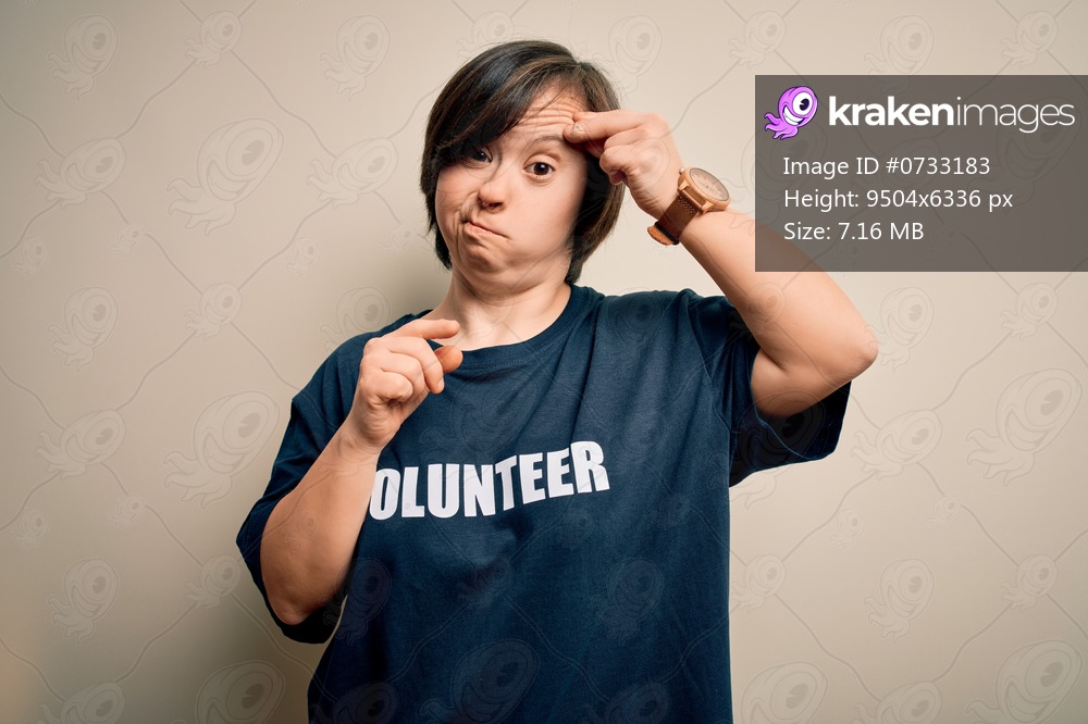 Young down syndrome volunteer woman wearing social care charity t-shirt worried and stressed about a problem with hand on forehead, nervous and anxious for crisis - Kraken Images