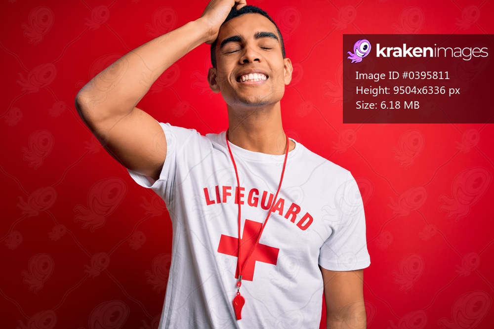 Young handsome african american lifeguard man wearing t-shirt with red cross and whistle smiling confident touching hair with hand up gesture, posing attractive and fashionable - Kraken Images