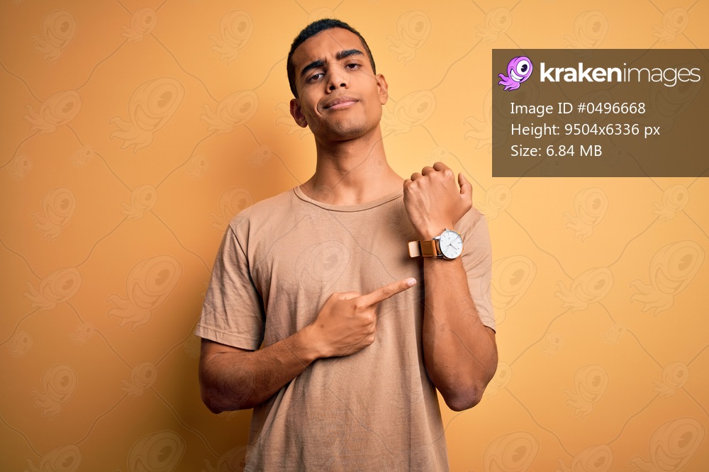 Young handsome african american man wearing casual t-shirt standing over yellow background In hurry pointing to watch time, impatience, looking at the camera with relaxed expression - Kraken Images