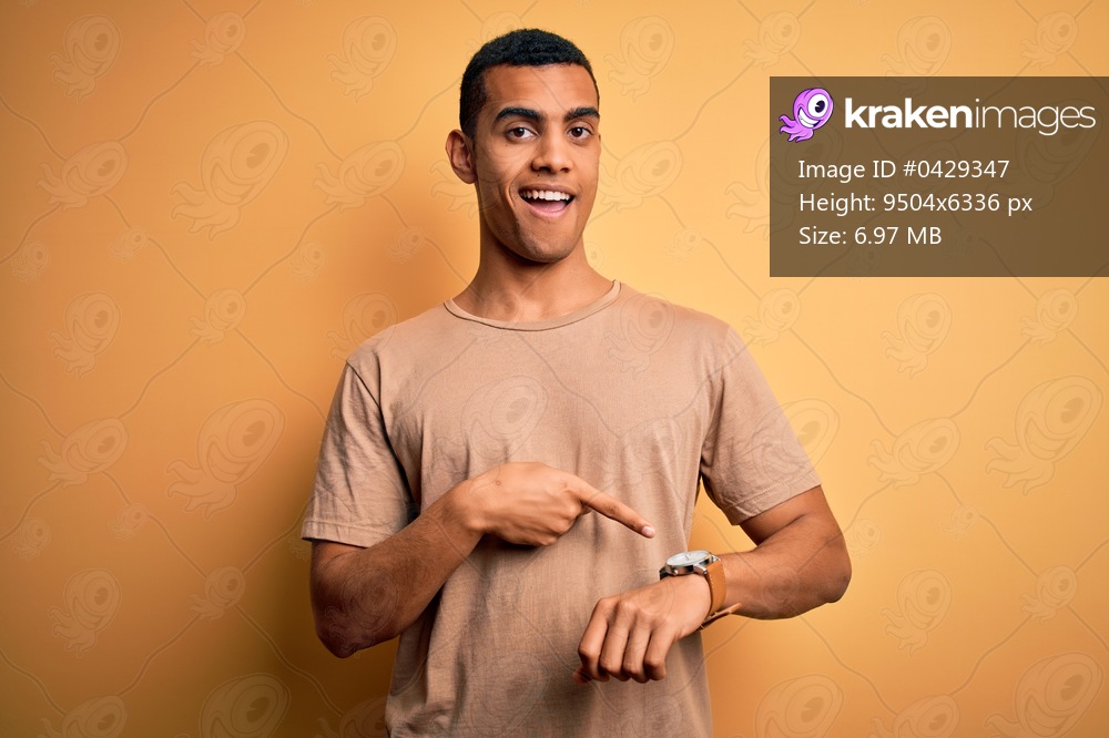 Young handsome african american man wearing casual t-shirt standing over yellow background In hurry pointing to watch time, impatience, upset and angry for deadline delay - Kraken Images