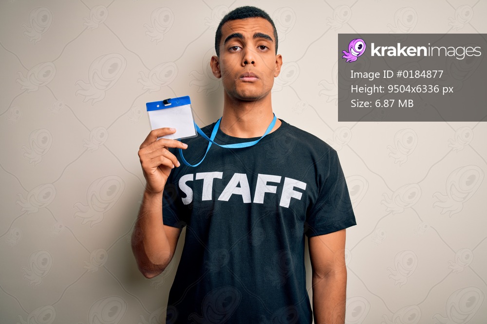 Young handsome african american worker man wearing staff uniform holding id card with a confident expression on smart face thinking serious